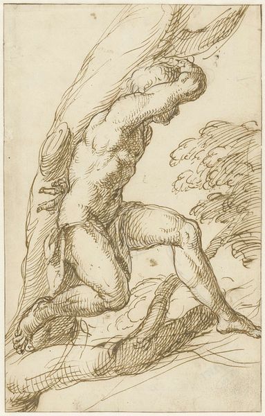 This is Raphael's "Study of a Warrior on Horseback" at the Städel Museum, a drawing, that presents a captivating study in form and motion. Rendered in chalk, the composition is dominated by the muscular figure of a warrior, viewed from behind, dynamically posed atop a horse. Raphael masterfully employs line and shading to delineate the warrior's physique, accentuating the tension and power in his stance. The fluid lines of the drawing emphasize the body's articulation, capturing a sense of latent energy and potential movement. The inclusion of partial armor sketches further underscores the work's focus on the human form within the context of military readiness. The study exemplifies Raphael's engagement with classical ideals of beauty and the heroic figure, filtered through his distinctive Renaissance sensibility. The interplay between line, form, and implied movement reflects not only Raphael's technical prowess, but also the broader humanist concerns of the era. It allows us to reflect upon the artistic process, where the artist grapples with form, movement, and expression.