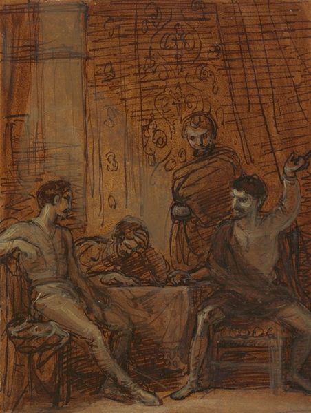 Curator: Welcome. Before us is Camil Ressu’s watercolor, “After Work,” created in 1913. Editor: Immediately, the painting strikes me with its somber mood. The muted palette of browns and blues creates a heavy, almost melancholic atmosphere, despite the seemingly relaxed scene. Curator: Ressu's technique emphasizes planar construction and a reductive simplification of forms. The figures are blocky and solid, possessing weight without internal detail, existing largely as pure color and shape within the compositional space. Editor: It’s the very archetypal image of weary men at rest. They gather, but their eyes suggest deeper stories— perhaps the burden of their labor and simpler existences is too big of a pressure. Their hats function as symbolic protectors or markers of the labor class of that era. Curator: Yes, note the strong horizontality and verticality structuring the space, anchored by the angles and gestures. The use of shadow emphasizes their grounded nature; and the subtle variation within the restricted palette enhances a sense of depth and form through contrast and hue differences. Editor: Water, tables and beer steins are age-old visual symbols here—elements in which folks gather to drown sorrows, to build communities, and to take a momentary escape from harsh conditions. Curator: Intriguingly, despite the seeming lack of technical sophistication in representation, Ressu very rigorously calibrates each of his color modulations with its local effect on overall compositional balance and visual experience. Editor: It echoes similar imagery of working class life and community across diverse cultures and continents—perhaps a subconscious connection resonates from collective memories. "After Work", indeed: the symbolic heart of people in shared suffering and companionship. Curator: So, one appreciates Ressu's deft modulation and deployment of what otherwise is limited by his chosen genre conventions; it seems he knew that reduction would be his avenue to compositional integration and effect. Editor: As we turn to consider other pieces here, it seems our stroll in looking back at "After Work" will leave one considering enduring connections between communities, stories and spirits throughout our present moment.