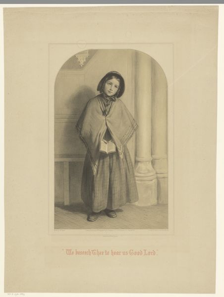 Curator: Here we have Auguste Tilly's "Staande jongen," or "Standing Boy," an etching dating from somewhere between 1850 and 1898. Editor: He seems profoundly uninterested in being standing. Is it just me, or does the slight blurring of the line-work give the portrait a strangely haunting quality? Curator: The academic style lends it that weight, certainly. But note the Romantic leanings as well; the solitary figure, the implicit narrative. The boy seems staged, positioned, even, as "hope of the nation," suggested in the description below the portrait. His stiff pose conveys that prescribed role. Editor: "Spei Patriae?" You're right, the phrase leaps out now I notice it. A slightly melancholic hope, it strikes me. All those historical connotations, those expectations projected onto one young, probably bewildered individual. His hair, that dreamy stare... It makes you wonder about his fate. I am picking up themes related to the weight of the past and destiny. Curator: Absolutely, we often overlook the loaded symbolism of childhood in art, how innocence becomes a vessel for collective aspirations. Editor: Well, art has always trafficked in potent mythologies. I can easily feel some threads reaching back centuries: royalty or the wealthy and nobility displayed their scions in artworks similarly in order to demonstrate family legitimacy. Curator: The print medium here suggests broader distribution, a democratized form of projecting those hopes. It invites wider participation in that narrative of national identity and succession. Editor: Yes. Makes it a poignant cultural artifact about societal values. Although this romantic lens tends to overlook actual experiences; the cost on any one child shouldering such pressure is hard to gauge but worthy of note. Curator: Indeed. So much resides unspoken in this ostensibly simple image. Editor: Art, a window and a mirror at once! Let's move on and reflect again.