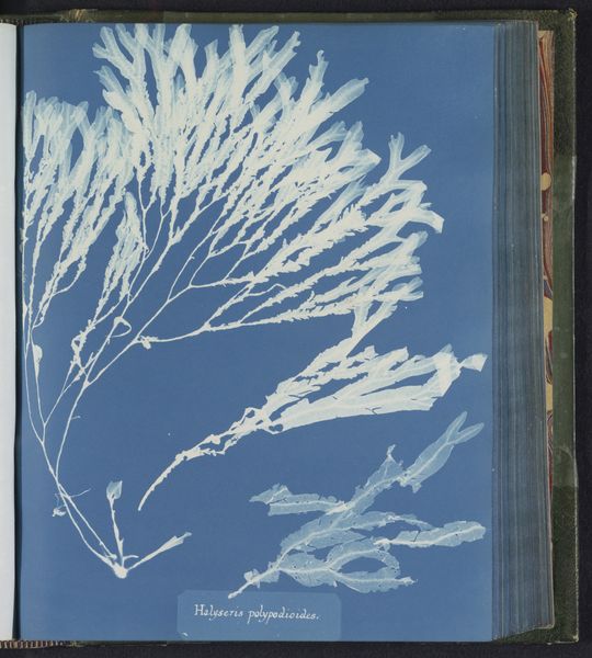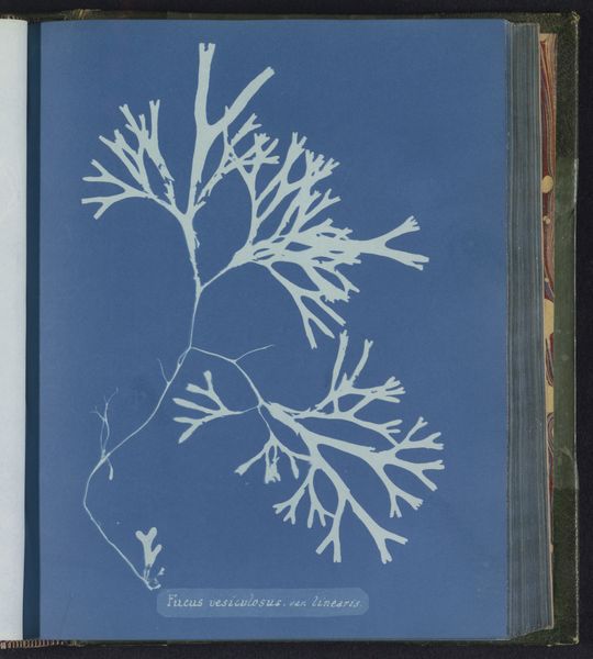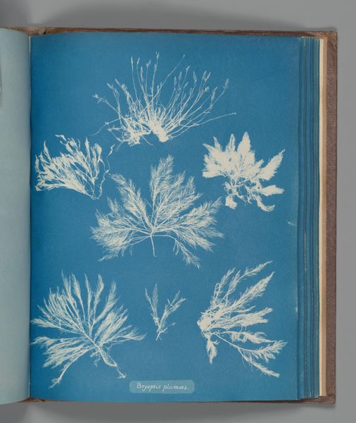Editor: This cyanotype by Anna Atkins, *Conferva rupestris,* from around 1843 to 1853, presents various seaweed specimens in stark white against a beautiful Prussian blue. The texture seems almost… ethereal. What draws your eye when you look at this image? Curator: Immediately, I’m drawn to the process. Atkins' choice of cyanotype is crucial here. It wasn't just a method of reproduction; it was a cutting-edge scientific tool that collapsed the boundaries between art, science, and industry. How do we categorize this work, considering Atkins made multiples? Editor: That's a great point about categorization. I suppose calling it "photography" is also tricky, since it doesn't rely on a camera lens. So where do you place this? Curator: Precisely. Atkins produced contact prints, not direct representations. The means of production — sunlight, treated paper, the specimen itself — are integral to the artwork's meaning. Consider the labor involved in preparing the chemicals, gathering the seaweed, meticulously laying it out, exposing the print… the labor is significant. She also challenges established notions of high art by employing photography, which in its early stages, was considered by many merely a technical craft. Is there any sense of scale when looking at this photograph? Editor: Not really! It's hard to get a sense of the size of the seaweed; this could be minuscule or massive. I never considered that before! So much about her materials changes our perspective. Curator: And it prompts us to re-evaluate our understanding of photography's role in art history. It questions the hierarchies we've created. These seemingly simple cyanotypes are quite radical when you examine their materiality and context. Editor: I now see how questioning the process reframes the work entirely. Thanks for illuminating that for me! Curator: It's through understanding the labor and the material context that we can truly appreciate the significance of works like *Conferva rupestris*. I appreciate you raising this point for the audio guide.