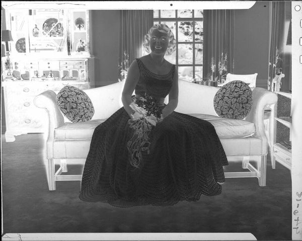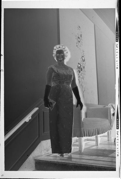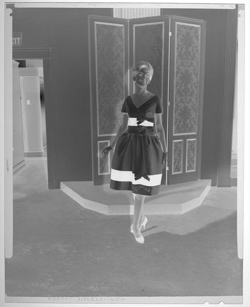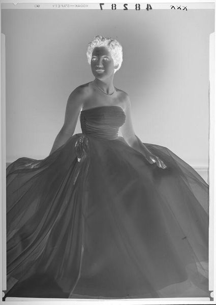 Curator: This photograph, "Untitled (woman in strapless dress)," comes to us from Lucian and Mary Brown. I find it quite striking. Editor: It certainly has an ethereal quality to it, almost like a ghostly apparition emerging from a classical interior. Curator: Indeed. The very process of photography – the chemicals, the light, the darkroom – all contributed to the final material object we see. Editor: And the composition itself, the careful framing of the woman against the doorway, it suggests a liminal space, a transition. Curator: I wonder about the social context. What was it like to sit for a portrait then, what was the labor that goes into producing this image? Editor: It’s a fascinating intersection of form and content. Curator: Absolutely. It makes you ponder the layers of meaning embedded within. Editor: Definitely a photograph that invites contemplation.