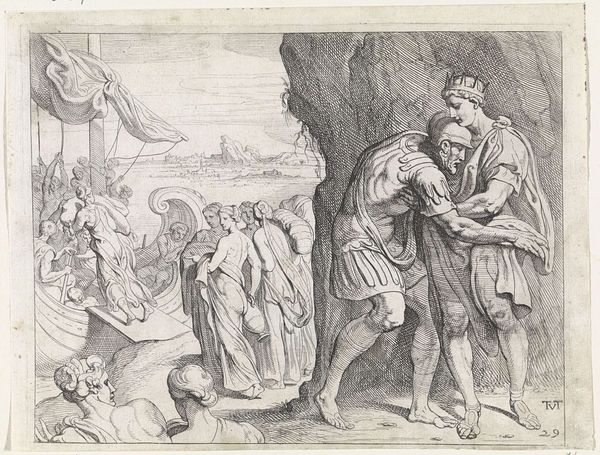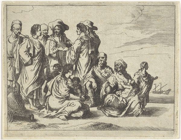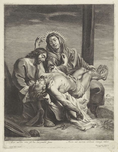 Curator: This is Frederik Ottens' "Kruisafname," or "Descent from the Cross," an etching and engraving from sometime between 1718 and 1770, housed right here at the Rijksmuseum. Editor: My first thought is, what a profoundly sad, solemn scene. The somber grays really emphasize the weight of the moment. Curator: Absolutely. The work comes from a specific cultural context, steeped in religious iconography. Consider the power dynamics inherent in depicting such a scene during the height of European colonialism and religious hegemony. What stories are amplified, and whose voices are silenced in this depiction of collective grief? Editor: Well, beyond that, it also feels as though we're seeing echoes of earlier depositions – like the intense emotion and body language that feels closely tied to the legacy of Caravaggio’s work in the previous century, a legacy very popular in Baroque Rome from which Ottens borrows. The composition has been reworked countless times across many eras. The central figures, the limp body of Christ, the supporting men, and grieving women--all these are archetypes. Curator: Precisely. And these archetypes perpetuate certain narratives while suppressing others. Are we meant to simply accept this image as a universal symbol of sacrifice, or should we question the power structures it reinforces, the historical conditions that allowed it to emerge and flourish? Look at the subdued role of women; their sorrow is palpable, but their agency is minimal, fitting into specific culturally enforced gender roles. Editor: True. But look closer at the composition. Ottens has subtly shifted things, using light and shadow to draw your eye across and up from the basin on the lower left to the face of Christ and ultimately, upward into the clouds. He's reminding us, visually, of a divine plan – something greater than immediate sorrow. The clouds even suggest a sort of ascension about to happen in the larger story. Curator: That formal analysis is valid, but I see it through the lens of political and social discourse. The ascent towards some divinely ordained hierarchy reinforces systems of power. Are the masses, represented by those grieving figures, being subtly urged to accept their earthly lot in anticipation of some future reward? This image doesn’t just represent a Biblical event, it participates in a much larger, ongoing cultural narrative of dominance and subjection. Editor: An interesting, though sobering point to consider. This print is so rich in historical imagery, from the cross to the faces in mourning. It will always evoke the emotion connected to an essential and poignant memory. Curator: I agree; it’s important for us to acknowledge those emotions even as we critically analyze the societal contexts within which these symbols operate.