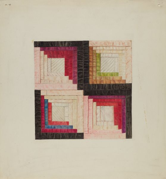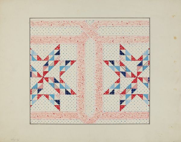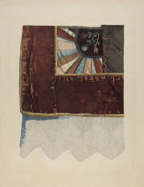 Editor: This is Ann Gene Buckley's "Colonial Pocket," made around 1936, a watercolor and textile piece. It looks like a drawing of a patchwork apron. The mix of patterns is really intriguing. What do you see in this piece? Curator: I am immediately drawn to the construction of the composition. Buckley uses a patchwork design, ostensibly of textile squares, but renders them in watercolor, thereby creating a layered experience for the viewer. Consider the tensions created by the flat rendering against the expectation of textile texture. The implied domesticity juxtaposed with its delicate execution on paper opens lines of inquiry. Editor: It’s like she’s playing with our expectations of what the materials should be, how the final product should look. Why watercolour? Curator: Indeed. Notice also the artist's choices regarding line and form. The lines are deliberately naive, lacking the precise contouring we might expect, furthering its unique, handcrafted essence. It is critical to view these design elements and deliberate material uses through a Formalist lens in order to discern Buckley’s strategy. Editor: So, focusing on how she used materials, color, and form, regardless of its domestic function, tells us what she may be trying to convey. It’s less about what the image represents and more about how it is made. I hadn't thought about it like that! Curator: Precisely. Analyzing how Buckley manipulated these pictorial strategies to emphasize flatness, craft, and the deconstruction of an historical feminine form opens valuable insights into art production, even if we acknowledge further avenues for discussion. Editor: Thanks for that perspective. I think I understand the formalist approach better now!