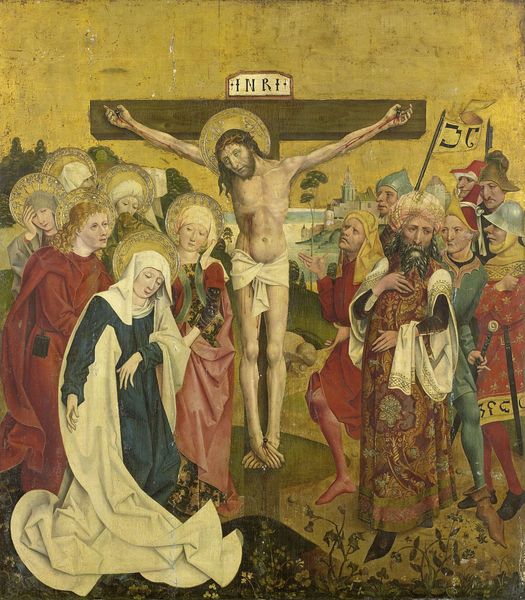 Editor: Here we have a fascinating oil painting titled "Mount Calvary," dating back to somewhere between 1435 and 1445. It's by an anonymous artist and currently housed in the Städel Museum. The intensity of the scene is really striking. What is your take on it? Curator: Indeed, this work is striking! As a historian, what jumps out at me is how the painting engages with the burgeoning public devotional culture of the 15th century. Consider the emotional intensity and the focus on Christ’s suffering. What effect do you think these depictions would have had on the people viewing them? Editor: I imagine it would be very moving, even disturbing. The expressions on the faces in the crowd below seem to reflect that. There's a real sense of drama. Curator: Precisely. The placement of the scene feels almost like a stage, and that is what gave painting its public, often political, role at that time. What do you think of how the artist renders the figures of authority compared to, say, the Virgin Mary and her companions? Editor: It feels like a clear visual hierarchy is being established, almost justifying their actions in a strange way. The Virgin and her group seem isolated, suffering, whereas those figures exude power and control. Curator: And that points to how artistic choices became wrapped up in reinforcing social and religious structures of the time. Works such as these were instrumental in shaping a specific view of power dynamics. How does that make you view the painting overall? Editor: It definitely casts it in a new light, makes you think about who the intended audience was, and how the artist might have been subtly reinforcing the status quo, alongside telling a religious story. Curator: Exactly! Considering art as part of a wider public narrative gives us critical insight into its purpose and legacy. I've certainly learned something new thanks to our dialogue.
