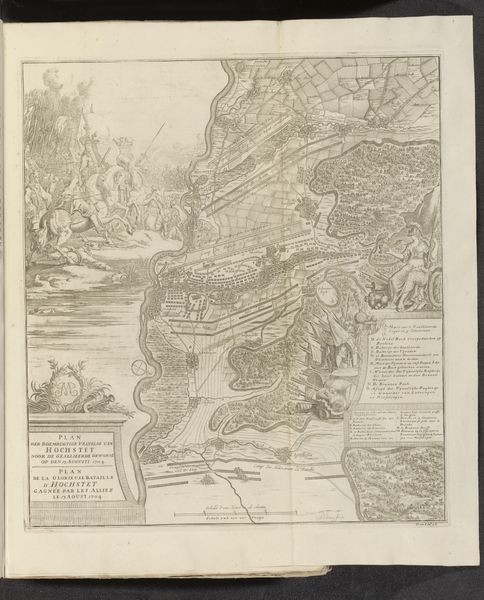Jan van Vianen created this etching, "The Battle of Höchstädt, 1704," using lines to articulate space and action. The composition is divided into zones: war on the left, the map in the middle, and allegorical figures to the right. Vianen merges cartography with narrative. The map’s precision contrasts sharply with the chaotic battle scene, destabilizing any fixed perspective. Lines define the topology, which then meet the expressive lines depicting the movement of soldiers and the natural forms in the landscape. The allegorical figures, rendered with precise lines, function as symbols. They add a layer of interpretation, inviting us to decode the meanings of victory and defeat. The arrangement reflects a desire to impose order onto the randomness of war, yet the etching admits the impossibility of fully containing the chaos. The artist uses line to guide the eye and prompt contemplation about history and representation.