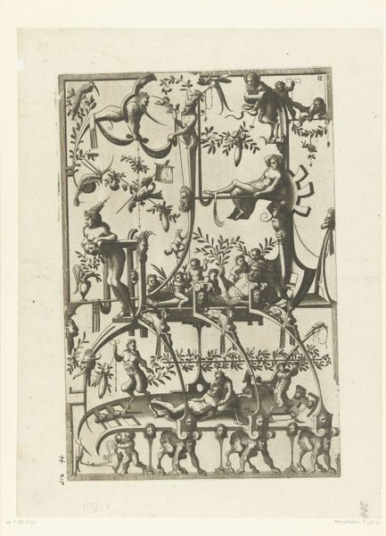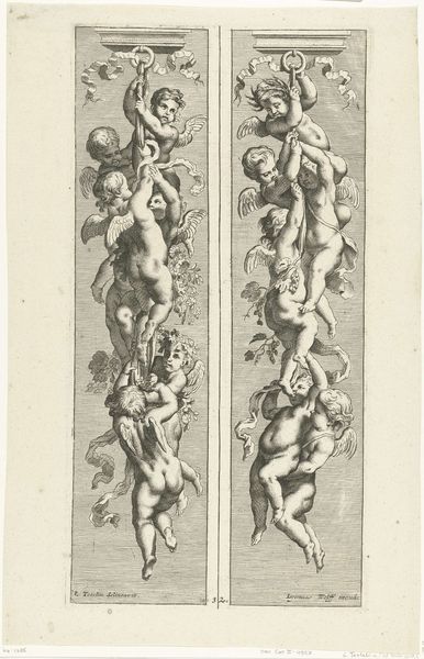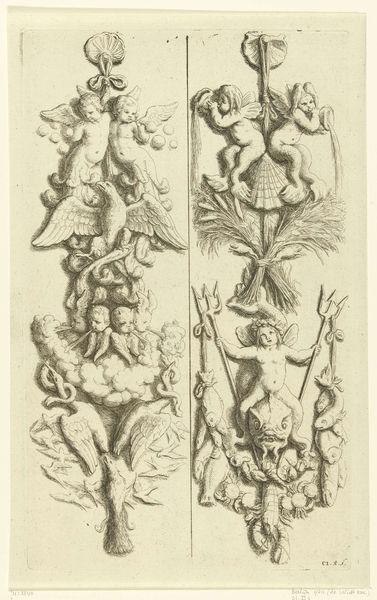 Curator: Here we have a print from before 1724, currently held in the Rijksmuseum, called "Twee trofeeën met putti." It is an engraving rendered in ink. What do you make of it? Editor: It feels quite whimsical and airy. The putti, or cherubic figures, create a sense of lightness, even though there’s a definite formality to the composition, contained in these very strict vertical frames. Curator: Indeed, these "trophies," or decorative panels, were immensely popular in the Baroque era. Prints like these served a distinct function within the visual culture. Editor: As architectural ornaments? This imagery feels overwhelmingly ornamental. I wonder how these cherubs were seen, particularly if we think about labor hierarchies and child exploitation. Were they just purely decorative, or did they evoke larger themes? Curator: Absolutely both. Allegory was a popular theme, and the putti symbolized love, divinity, or even artistic inspiration. The interesting thing is these kinds of prints provided pattern books or source material for artisans and craftspeople. Furniture makers, plasterers – could adapt these designs in myriad of ways. Editor: So it’s interesting, this piece is actually quite accessible, because these cherubic figures carry over centuries of art, we still know them and see them in advertising. The ribbons and swags they're holding aloft are clearly of that earlier Baroque style, a perfect reflection of the era’s embrace of opulence. But that sweetness sits a little uncomfortably with our contemporary sensibilities about children. Curator: That contrast gets to the core of considering visual culture as it evolves through different sociopolitical lenses, and how meanings are very unstable. It forces us to engage with art as something actively negotiated, and it keeps the conversation fresh and insightful. Editor: Exactly. Analyzing the shifting reception of the work helps us understand not just the past, but how we interpret the present. This really emphasizes the vital need to examine art through an intersectional, social and historical lens.