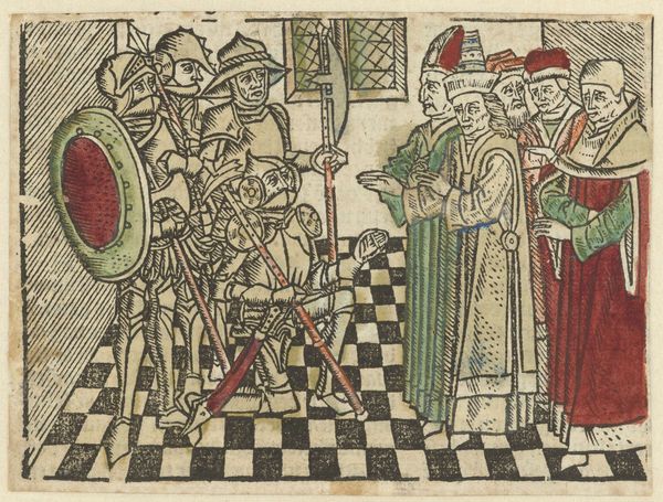 Curator: This compelling piece is "Judas bij de hogepriesters om Christus te verraden," or "Judas with the High Priests to Betray Christ," attributed to the Master of Antwerp (I), created sometime between 1485 and 1491. Editor: The intensity in this image is immediate; the confined space, the rigid figures... It feels very theatrical, like a stage about to erupt. Curator: The symbolism is indeed rich here. The assembly of figures, all clustered together and rigidly posed, conveys the grave act being considered. Notice how their garments demarcate social roles and signal hierarchy. The high priests are adorned with ostentatious robes and tall hats, meant to telegraph their power. Judas is dressed in darker hues, signifying his devious, wicked role. Editor: And observe how Judas is almost at the margin of the composition, on the left: it’s symbolic banishment even within this inner circle, pre-empting the consequences that he will meet after committing such a foul action. What also catches the eye is how there is an exchange occurring in this sacred room, turning something holy to wicked. Curator: Precisely! What makes it particularly poignant, thinking from today’s standpoint, is this moment represents a significant crack in the foundations of power and established religious orders. It is like a crisis brewing, ready to burst to the surface, reflecting widespread concerns in a highly structured, but fragile era. The artist does not simply portray a biblical story, but seems also to gesture toward broader issues of moral authority. Editor: I agree; there's something about the rigidity that amplifies this sense of fracture. But what this picture means over time too: what do people take away today when they see Judas portrayed bargaining with men of the cloth, as if the sacred can be brokered for a price? Perhaps its a cynicism to be mindful of, the loss of idealism and faith? Curator: A sobering thought, indeed. Ultimately, what strikes me is its resonance, how a relatively simple image from the late 15th century continues to spark debate and reveal multiple levels of meaning depending on who's looking at it, even now. Editor: A great work. And I’ll leave this place reflecting a little more on those dark figures huddled there, contemplating the weight of betrayal in the shadows.