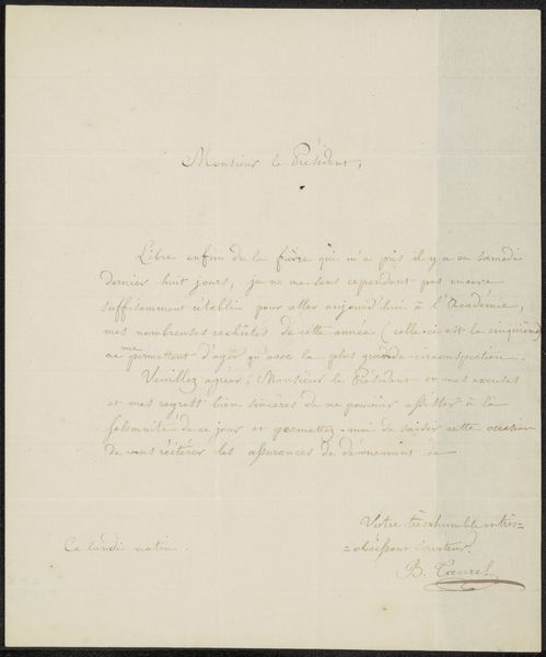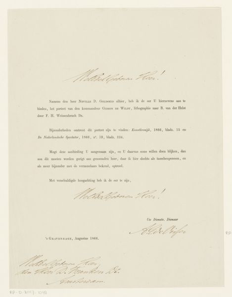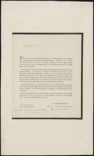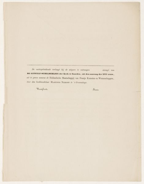 Curator: This piece, titled "Overlijdensbericht aan Johannes Immerzeel," which translates to "Obituary to Johannes Immerzeel," is thought to have been created around 1838. What catches your eye about this particular print? Editor: The austerity of it, almost minimalist! You know, that dark ink on thin paper really emphasizes the starkness of death. And you get a feeling for how textiles were important back then, as if paper itself wanted to resemble something durable and lasting. It really hits home. Curator: You picked up on some fascinating points! It’s interesting that the material reminds you of cloth; that would indicate something of importance, as this obituary combines paper and typography. It makes us think about production too, given the labor behind typesetting and printing. The artist probably wanted to create something permanent for this remembrance. Editor: Absolutely. Look at how crisp the lettering remains after all this time. You have to imagine someone meticulously arranging those characters by hand. These printed announcements—they were probably somewhat of a status symbol, right? For loved ones but maybe also as part of larger public record... Who knew typography could be so emotionally potent? Curator: Precisely. These objects straddle the personal and the societal. Think about the ripple effect that simple black ink and precisely laid-out lettering held back then. Each copy shared creates the possibility of creating an atmosphere that is unique and moving at the same time. It is also academically intriguing as a unique expression in early modernism. Editor: Thinking about the labor involved definitely gives me a renewed perspective. We sometimes gloss over the craft embedded even in these relatively reproducible artworks. Thank you for shining the light on such details, adding layers to appreciate. Curator: Indeed. Thinking about the artistry, design and labor helps you connect it to personal history, offering a new appreciation, perhaps, for the emotional landscape.