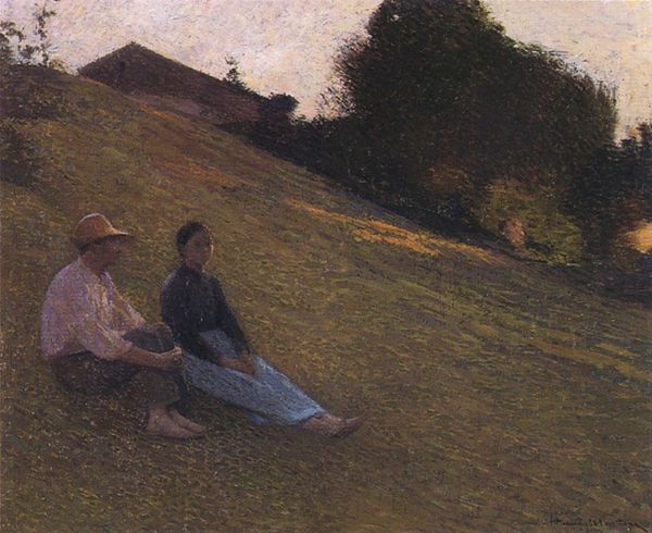 Henri Martin created "Amour" during a period of significant social change in France, influenced by debates around identity. "Amour" presents an intriguing study in contrast, placing the figures centrally within a vast landscape. The two figures, possibly a heterosexual couple, sit together, creating a scene of intimacy. The painting complicates traditional depictions of romance, by situating the subjects within a broader, less defined social narrative. The figures in "Amour" invite reflections on gender roles and class. The woman is dressed in a darker colour, and the man is wearing a white shirt. There is a subtle comment on the changing dynamics within relationships during the early twentieth century. Martin’s choice to situate the couple amidst a landscape encourages us to reflect on our relationship to the environment. "Amour" encapsulates a moment of quiet contemplation.