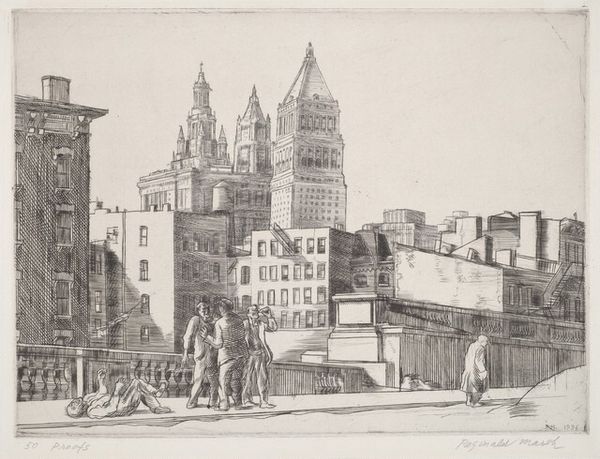Henry Rushbury created this print of Saint Victor, Marseilles, using etching techniques, resulting in a rich, textured surface. The composition, with its strong diagonal lines of the bridges and staircases, draws the eye upward towards the imposing architectural structures. The artist masterfully uses light and shadow to create depth and volume, giving the scene a dynamic, almost theatrical quality. Rushbury’s choice of perspective and detail suggests a deeper engagement with the semiotics of urban space. The bridge serves not only as a physical connector but also as a signifier of transition, a bridge between different social spheres. The architectural forms loom with a structural language that speaks to both solidity and impermanence. Note how Rushbury employs a limited tonal range, focusing on the interplay of light and dark to define forms. The artist doesn’t simply replicate reality but constructs a visual field that allows the viewer to ponder the relationship between place, structure and the human experience. This emphasizes the constructed nature of our perceptions and the constant re-interpretation of the world around us.