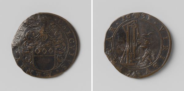 This is a Gelderse duit made in 1690 by the Province of Gelderland. The copper coin has a circular form, its surface a study in relief and intaglio. The duit's design is structured around two primary elements: text and heraldry, each side presenting its own distinct visual language. The text side displays letters and numbers arranged within a wreath, a formal convention used across various historical currencies to denote value and origin. The heraldic side features a shield bearing symbols of regional identity, framed by ornamental foliage. Consider the semiotic implications of this object. The text isn’t merely descriptive; it is performative, declaring the coin’s legitimacy and function. The heraldic imagery operates similarly, invoking history and authority. The worn texture of the copper enriches the coin's communicative power, each scratch serving as a tangible link to its historical circulation and use.