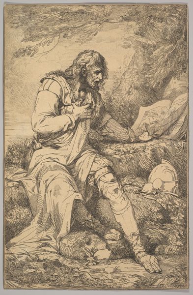 John La Farge created this ink drawing titled "The Travelers and the Giant". In it, we see a giant hunched over, his massive form casting a shadow over two travelers. The giant's posture—head in hand— recalls the melancholic, brooding figures found in antiquity. This gesture, signifying introspection and sorrow, echoes through the ages, from classical sculptures to Renaissance depictions of prophets. The contrast between the giant and the travelers presents a timeless struggle, a motif explored in countless myths and legends. Consider the role of giants in folklore: they often represent untamed, primal forces. Here, the giant appears subdued, perhaps even vulnerable, challenging our expectations. The travelers' raised hands suggest supplication. The power of this image lies in its ability to evoke a deep, subconscious understanding of human vulnerability when faced with overwhelming forces, both internal and external. This motif resonates in our collective memory, prompting us to reflect on our own struggles and the universal quest for understanding.