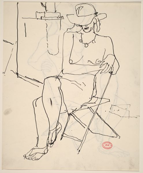 This is Hans Borrebach’s drawing of a standing woman by a signpost, made with ink on paper. The limited palette of black and white gives the image a graphic feel. The process of drawing is very much on display, each line carefully placed, with some areas filled with dense, solid marks and others left open with sparse, gestural strokes. Look at the woman's skirt, how Borrebach uses dense hatching to create shadow and volume. This contrasts with the bare outline of her legs and the crisp, economical lines of her shirt. It's a study in contrasts, creating a dynamic visual rhythm. The signpost above her head points in multiple directions, topped with a heart pierced by an arrow. Borrebach seems to be riffing on some of the same themes as someone like David Hockney, who also has a playful way of imbuing seemingly simple scenes with a knowing, slightly melancholy wit. Ultimately, the drawing remains ambiguous, prompting us to ponder the woman's journey and the choices she faces.
