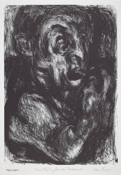 Curator: Looking at Oskar Kokoschka's "Corona I" from 1918, a somber mood seems to immediately wash over me. What’s your first reaction? Editor: The nervous energy in this portrait is palpable. The frantic strokes, the unsettling gaze. There’s very little smooth line work present; it's like raw emotion made visible. Curator: Absolutely. Kokoschka was deeply affected by World War I, having served and been severely wounded. This print was created near the end of that conflict, during a time of intense political and social upheaval across Europe. It’s hard not to see the anxieties of that era reflected. Editor: Notice the hatching, though. The density varies, creating this interesting play of light and shadow. It almost sculpts the form out of pure anxiety, wouldn’t you say? The way the hair is rendered, chaotic but somehow contained...fascinating! Curator: He captures a profound sense of psychological depth using such raw materials. His art became about confronting societal wounds. And in those jagged lines, you see that struggle and that effort in the lines of the face. There’s a sense of disillusionment that becomes almost universal during this time. Editor: But beyond the historical context, the drawing works brilliantly on a formal level. It challenges conventional portraiture by revealing a subject's internal state through purely visual means. Curator: Yes, the formal properties certainly enhance Kokoschka's vision, a reflection of a war-torn world, as filtered through Kokoschka’s subjective vision, the drawing offers a haunting glimpse into the psychology of a generation grappling with trauma and uncertainty. Editor: I’ll agree with that! Analyzing this print reminds me to look past conventional boundaries to uncover true form. Curator: And it demonstrates how social context deeply intertwines with the reception and understanding of art. It provides unique lenses through which viewers might engage more fully with such works in galleries and museums.