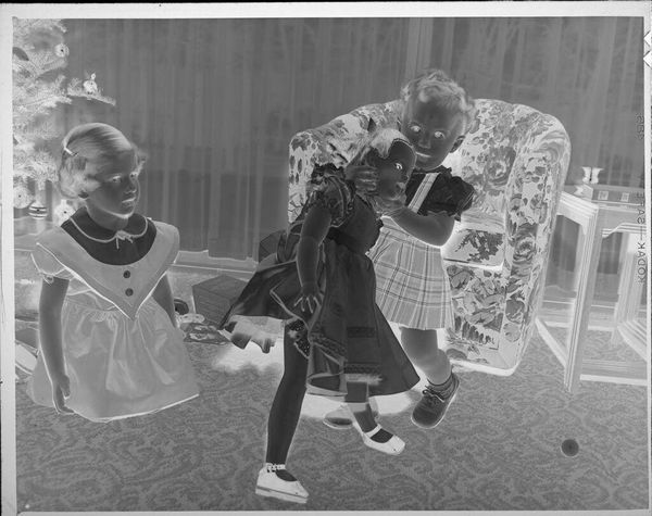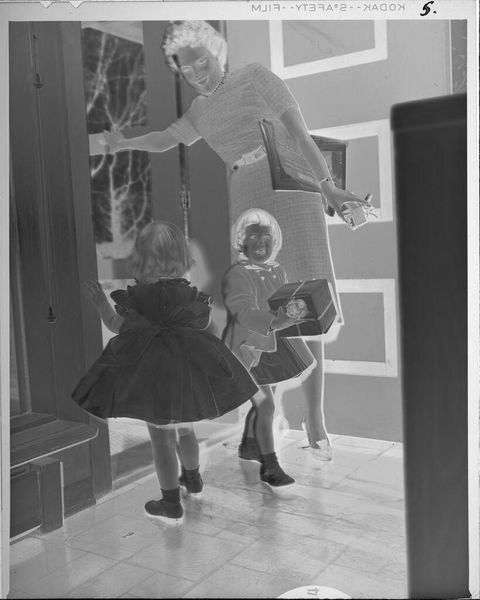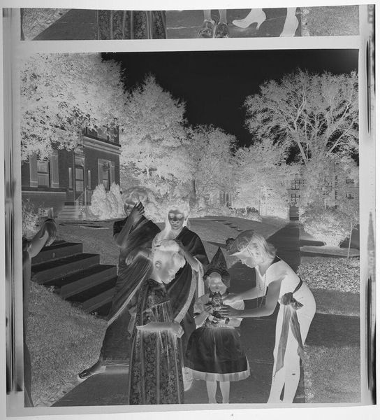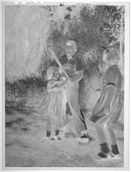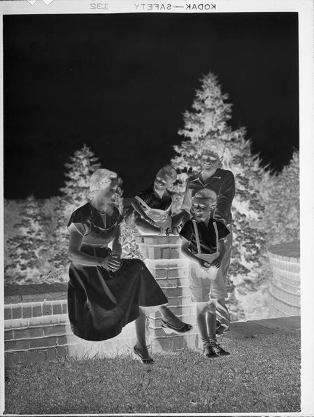 Editor: This small, undated gelatin silver print, "Untitled (woman and three boys on brick wall outside)" by Lucian and Mary Brown, feels like a captured moment of everyday life. What can you tell me about the context surrounding this type of image? Curator: The image complicates the public/private binary. Photography became increasingly accessible, and families started documenting themselves. But why keep the negative? Did the artists see something more, a potential for public consumption or artistic merit in this seemingly ordinary scene? Editor: So, it raises questions about the intent behind even casual-seeming photographs. Curator: Exactly. It reminds us that even personal photographs are shaped by the broader culture and technology of their time. It makes you wonder if the artists ever saw the final product. Editor: That's a fascinating point; I'll definitely look at family photographs differently now.