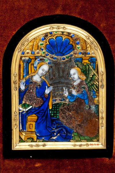 Curator: This small, intricate panel depicts the Coronation of the Virgin, dating from the 16th century and attributed to Nardon Penicaud. It’s currently housed here at the Minneapolis Institute of Art. Editor: It has a kind of otherworldly gleam to it, almost jewel-like. The colours, especially the blues and golds, are so intense despite its small size. It must be quite something to see it in person. Curator: Absolutely. This work showcases the mastery of enamel painting during that period in France. Think about the craftsmanship involved: the layers of enamel, the controlled firing, all contributing to its luminous effect. It's not just pigment; it's fused glass, an incredible transformation of raw materials. Editor: You know, seeing the Virgin being crowned always brings up questions of power and submission. Considering its historical moment, who exactly was commissioning art of this nature? What intersectional tensions were being expressed or, more likely, suppressed by these devotional pieces? Curator: That's precisely the kind of questioning we need. Royal patronage was obviously influential. Religious images weren't merely devotional objects; they served a very clear purpose in affirming and perpetuating a stratified social order. Mary becomes a vessel through whom social codes were being reified, in her femininity, motherhood, but also power. Editor: And notice the material wealth suggested. Beyond the raw skill and labour involved in producing enamel, it points to conspicuous consumption and access only available to a very privileged few. It becomes a document of both artistic ingenuity and stark economic disparity. The means of its production, after all, are deeply embedded within its visual narrative. Curator: I find it fascinating to contemplate the artist's position, too, nestled in the complicated context of artistic production within his own historical and political location. Did Penicaud, in crafting this piece, think about it as something beyond the sacred? Editor: I'm left pondering its resonance beyond the overtly religious symbolism. The artist manipulates materials, labor, and a religious subject. But more broadly it brings into sharp relief so much that existed behind its creation in its time. Curator: Yes, this opens up such rich ways of thinking about devotion, class, and craft! Editor: Absolutely, a small artwork prompting larger questions about making and meaning.