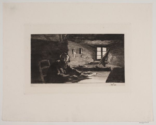 This etching by L.A. Schou depicts a woman knitting in a humble country dwelling, offering a glimpse into 19th-century domestic life. At its heart, the image vibrates with the quiet hum of everyday industry and the window serves as a symbolic motif, a beacon of light and hope in the darkness. The motif of the woman at the window finds echoes across centuries. Think of Renaissance depictions of the Annunciation, where Mary often sits near a window as she receives the divine message. This composition is not merely about light; it's about revelation, about a world beyond the enclosed space. Here, the window offers a view outward, yet also frames the woman within, suggesting her connection to both the interior world of home and the exterior world of possibilities. Such imagery delves into the subconscious, tapping into primal emotions and desires. It is a potent reminder of our shared human experience, resonating with the collective memory of home, hope, and the cycles of life that bind us all. These visual echoes create a powerful emotional experience, engaging us on a deep, almost instinctual level. The past is never truly gone; it resurfaces, evolves, and takes on new meanings in the ever-turning wheel of history.