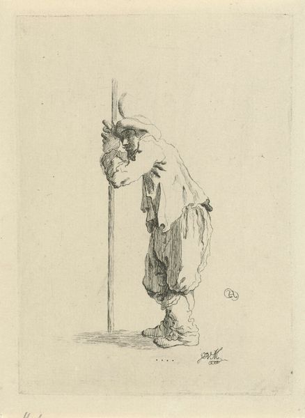 Rembrandt's Beggar in a High Cap Leaning on a Stick takes the work of Jacques Callot as a point of departure. Callot treated similar subjects on similar scale. Rembrandt added reckless energy to the calligraphic line employed by Callot. He provides us with a less sanitized view of the man, while also endowing him with individual humanity. The image appears completely spontaneous and unedited, as though we were looking at a page from Rembrandt’s sketchbook. However, closer observation reveals that he rethought his drawing. Originally the shadow beside the man would have impinged more fully on his form, but the truncated strokes of the zigzag lines tell us that Rembrandt partially masked his work with varnish before biting the plate in acid. In doing so, he released the man from the shadow to increase his monumentality.