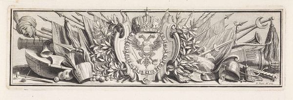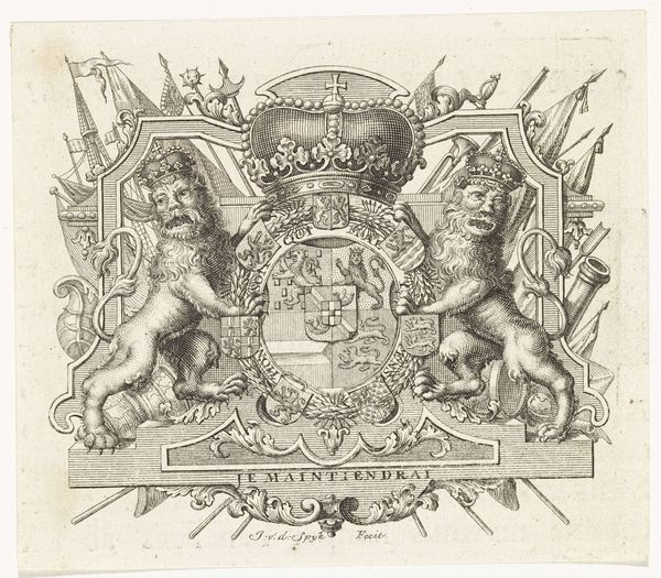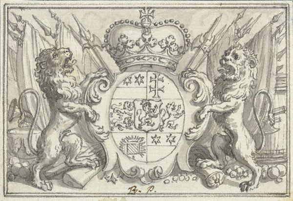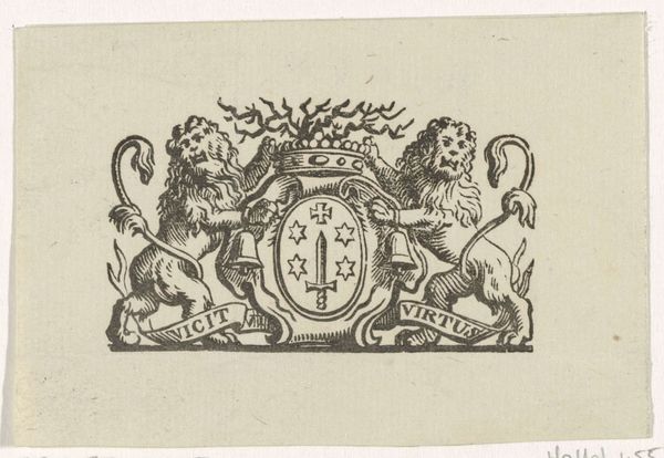 This is an undated, unsigned vignette with the coat of arms of the city of Haarlem. Its creation is tied to a time when heraldry and civic identity were deeply interwoven. Here, the symbols of Haarlem—a sword, stars, and a cross—are not merely decorative; they're emblems of power and historical narrative. The two lions stand as proud supporters, suggesting strength and valor. But who did these symbols really speak for? These civic emblems, while intended to unite, often obscured the complex social hierarchies of the time. This vignette may have been used on official documents or buildings, reinforcing a particular vision of Haarlem’s identity, one likely shaped by and for the city’s elite. The design’s bold lines and symmetrical composition evoke a sense of order and authority. Consider the stories that lie beneath these symbols, the voices that may have been marginalized in the making of this civic identity.