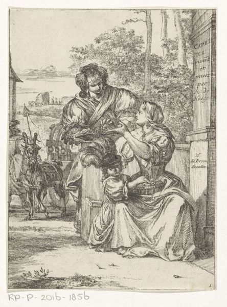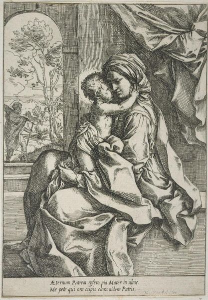 Editor: We're looking at Guido Reni's engraving, "The Virgin seated with the Christ Child on her lap embracing her, Joseph seen through an archway at left," dating from sometime between 1595 and 1618. It’s an intimate family scene, but something about the Virgin's downturned gaze feels melancholy to me. How do you interpret this work? Curator: That melancholy is a potent entry point. Look at the social context: during the Counter-Reformation, images of the Virgin weren't just devotional; they were statements of power and ideological purity. The Virgin becomes an allegory for the Church itself. Notice how Reni positions her physically elevated above the viewer. The very act of seeing her becomes fraught with social meaning. Editor: So, this image is doing more than just showing a mother and child? Curator: Absolutely. Consider Joseph in the background. He is relegated to the periphery, almost an afterthought, emphasizing the divine nature of Christ's birth and reinforcing patriarchal structures while simultaneously seeming to subtly undermine them. Where does real power lie? Who gets remembered? Editor: It's interesting to think about how gender roles are subtly negotiated even in religious iconography like this. It's not just a picture of the Holy Family but an assertion of specific values, intentionally and unintentionally encoded by the artist. Curator: Precisely. And by acknowledging these power dynamics, we can critically engage with the work's historical context and its contemporary relevance. Editor: I never thought about engravings this way, there's so much more than meets the eye. Curator: Always, always consider the context. Every line is a choice loaded with meaning.