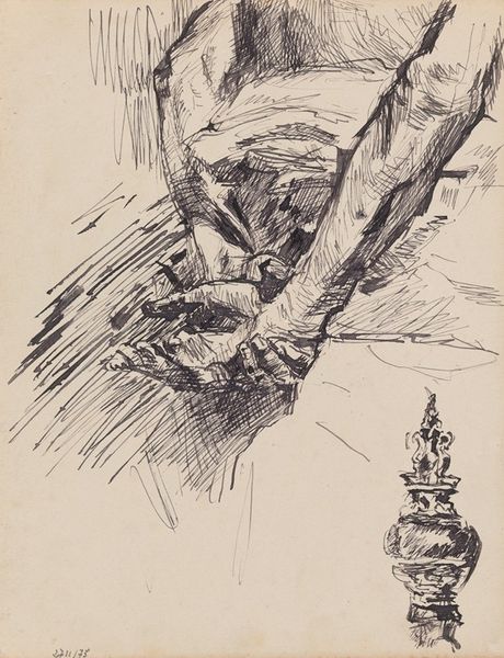 Johannes Tavenraat made this drawing of a hunter, dog, and slain animals with pen in brown ink, likely in the Netherlands during the first half of the 19th century. The swift, confident strokes of the pen work wonders in depicting light and shadow, giving form to the figures. Tavenraat employed hatching and cross-hatching to build up tonal depth, a traditional technique used to create volume with simple means. Notice how the ink pools in certain areas, creating darker accents that emphasize the weight and texture of the animals' fur. The gestural quality suggests a certain efficiency, as if the artist was capturing a fleeting moment. This sketch is imbued with the social and cultural significance of hunting, a traditional pastime for the wealthy. The artist emphasizes the labor of hunting, while also hinting at the social hierarchies inherent in access to land and resources. By looking closely at the materials and the way Tavenraat has handled them, we can see the full meaning of the artwork, pushing against traditional distinctions between fine art and craft.