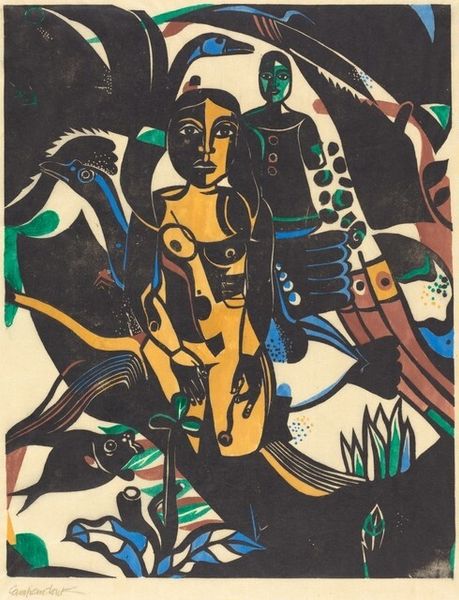 Editor: Here we have James Lesesne Wells's "African Nude," a 1980 woodcut print. I’m immediately struck by its bold color palette and how the shapes almost vibrate against each other. What's your take on this, considering it’s a print? Curator: Well, let's consider the woodcut medium itself. Wells wasn't just reproducing an image, but engaging in a process – the labor of carving, the inking, the pressure applied. How does this subtractive process, versus say painting, affect our understanding of “nude” and "African" as concepts being shaped by the very act of making? Editor: That's fascinating! So, the act of carving itself becomes part of the statement? It feels like he’s consciously choosing a more rudimentary method. Curator: Exactly! It distances the piece from academic traditions and, in a way, reconnects with the historical function of woodcuts - their origins lay in producing patterns for textiles, inexpensive religious images, and later book illustrations for the rising middle class. It also has some relation with pop art, with bold and defined masses and colors, a technique mostly used to produce printed material for large scale consumerism. Wells's work becomes an intriguing intersection of artistic intention, labor, material, and production possibilities. How does that impact our interpretation of it being a ‘nude’ artwork? Editor: So, we're not just seeing the subject matter, but also considering the artistic choices behind how it was created. It highlights how artistic labor and accessible materials interact to convey cultural meanings, shifting from high art toward craft tradition. Curator: Precisely. And considering his roots within the Harlem Renaissance, and the social and cultural importance of the African-American identity, how the African nude it represented using those techniques reinforce, reject or challenge social constructions of identity in that specific context. Editor: This perspective adds so many layers to how I see this work. Thank you. Curator: Absolutely, looking at process can unveil new understandings, always.