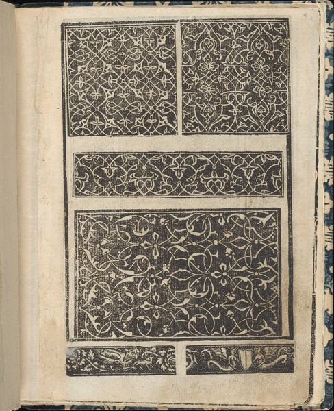 Curator: Immediately, I am struck by the precision of the lines and patterns. The work feels intensely detailed and almost meditative in its execution. Editor: We’re looking at a page titled "Ornamento delle belle & virtuose donne, page 7 (verso)," from a book by Matteo Pagano, created in 1554. It’s currently housed at the Metropolitan Museum of Art. The artwork employs engraving techniques in graphic art, acting as both a drawing and a print example used as pattern for needlework and lace. Curator: Engraving lends itself so well to this kind of minute, repetitive work. It is all lines and shapes but its also utilitarian at the same time. We see its influence on other artisanal forms like textiles and embroidery. You can imagine women of the era utilizing this almost as an instructional manual. Editor: Absolutely. Manuals like this played a key role in the spread of design ideas and tastes among a growing literate female population. The printing press made such designs accessible across social lines. Ornament books became highly valued tools, effectively democratizing aesthetic education and impacting fashion. Curator: These designs are all built from individual square motifs carefully composed. Notice the intricate details and geometric foundation. You start to wonder about the physical demands placed on those making this. Editor: Right. Understanding who had access to the knowledge contained in pattern books like this tells us a lot about social and gender history of the period. It's a physical trace of a visual and practical language. Consider how the church or political system also adopted ornamental language for themselves. Curator: The small format emphasizes the delicacy. It is both visually rich and utilitarian in its production for design work that emphasizes this. These weren't made for just walls. Editor: That is the exciting and most powerful dimension of works such as these - its influence trickles everywhere, decorating and influencing countless objects around us and forming everyday habits, which impact society at large. The level of dissemination and adaptation speaks volumes about the social aspirations of the rising middle class in society at this time. Curator: A truly remarkable item from the Met's collection, opening an important dialogue between design, use and labor from the past. Editor: Absolutely! A piece like this illustrates so powerfully how cultural and class dynamics were evolving because of mass media production.