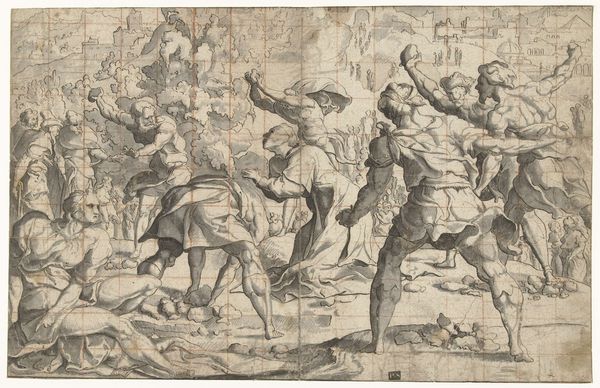 Curator: Here we have Orazio Borgianni's etching, "David onthoofdt Goliat," dating back to 1615, currently held at the Rijksmuseum. It’s quite a striking image, wouldn't you agree? Editor: Indeed. My immediate impression is one of intense action and baroque drama. The lines are quite energetic, almost chaotic, giving a real sense of movement to this pivotal biblical scene. Curator: The dynamism is central. Note the artist's skillful use of line—observe the variation in weight and density which help create volume and the dramatic light-dark contrasts characteristic of the Baroque style. Borgianni’s command over composition here, with the swirling figures, evokes a narrative immediacy, focusing particularly on the gruesome detail. Editor: Certainly gruesome! The image encapsulates the political anxieties and religious fervor of the early 17th century. Images like these served to promote moral lessons and to also consolidate power, reminding people about the swift justice for defying divine will. Considering that, the staging feels rather artificial. Curator: Precisely. And the spatial relationships, albeit somewhat ambiguous, push the action right up to the picture plane, immersing the viewer. The emphasis on form, the musculature, and dramatic poses, elevates it beyond simple storytelling. Observe Goliath's inert body; David seems more focused on performance, on presenting Goliath’s head. It’s as much a symbolic gesture as it is a historical depiction. Editor: Agreed, that presentation and exaggeration are vital. One has to consider who this piece was aimed towards: it acted to further instill ideals within a religious community and beyond. What message would others have perceived viewing it at the time, I wonder? Curator: A relevant point indeed. The piece's formal structure undeniably works in tandem with these social intentions; its dynamic tension keeps us enthralled. Thank you, it certainly allows one to appreciate Borgianni's visual narrative. Editor: Thank you. This exploration offers new appreciation on its interplay of structure, storytelling, and impact.