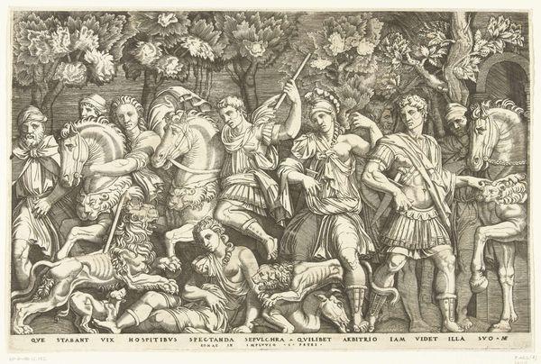Curator: Here we have "Trajanus tussen de stad Rome en Victoria" by Etienne Delaune, dating back to somewhere between 1528 and 1583. It’s currently held in the Rijksmuseum, and it’s an engraving on paper. Editor: Wow, my first impression is that it's intensely energetic! Like a freeze-frame of a victory parade that’s also, strangely, a scene of carnage. So many bodies in motion, even the ones on the ground. Curator: Precisely. Delaune, a prominent figure in the French Mannerist movement, was known for these densely populated scenes that served political purposes. The image constructs an idealized vision of Roman imperial power, with Trajan, a celebrated emperor, at its center. Editor: It’s amazing how he manages to pack so much detail into a relatively small print. All those tiny, meticulously rendered lines, creating texture and depth. The whole thing feels... ambitious. Is this supposed to glorify violence or showcase victory? The mix feels uneasy. Curator: Well, power and violence were inseparable in the Roman imagination, and, by extension, in the imaginations of Renaissance rulers keen to emulate them. Prints like these served as propaganda, circulating idealized visions of leadership and military prowess, often at the expense of historical accuracy or sensitivity. Editor: Propaganda...yes, it does feel very 'state-approved.' There’s an air of manufactured glory here that mutes any true sense of the human cost depicted here, underfoot even! Do you think contemporary viewers saw through this glorification? Curator: Some certainly did. It’s worth remembering that images like these were consumed in various ways, sometimes critically, sometimes with reverence, and often with a mixture of both. But, unquestionably, such visual rhetoric helped to normalize and perpetuate power structures. Editor: So even something seemingly simple as an engraving, mass-produced and circulated, had this latent power to shape perceptions, subtly dictating the terms of leadership. Now I feel the weight of this 'celebration' in a whole different way! Curator: Absolutely. And understanding that visual history, its deliberate construction and deployment, gives us a richer perspective on our own cultural moment. Editor: Right, and I suppose grappling with that history allows us to critically evaluate these narratives instead of accepting them outright. Curator: A perfect takeaway. Now shall we explore a rather less turbulent canvas?