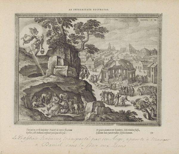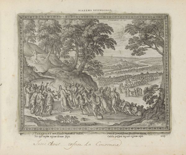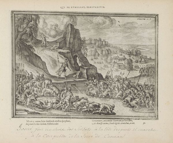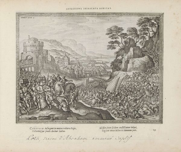 Pieter van der Borcht made this engraving, "Saul Committing Suicide," around the turn of the 17th century. It illustrates a scene from the Old Testament where King Saul, facing defeat, chooses to take his own life rather than be captured by his enemies. The image uses the visual language of its time to convey a moral lesson. Executed in the Netherlands, then deeply entrenched in religious conflicts, the print reflects the era’s preoccupation with themes of fate, free will, and the consequences of moral failings. Notice how the chaotic battle scene contrasts with Saul's isolated act, emphasizing the personal dimensions of tragedy amidst broader social upheaval. The Rijksmuseum, as an institution, plays a crucial role in preserving and interpreting such works. Through their collections, we can trace the history of ideas and artistic practices, understanding how artists like van der Borcht engaged with the political and religious concerns of their time. To delve deeper, scholars often turn to historical texts, theological debates, and the artist's other works, piecing together the complex web of influences that shaped this compelling image.