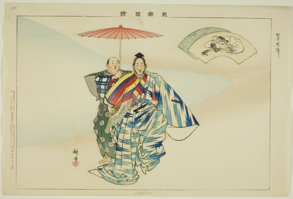 Tsukioka Kôgyo created this woodblock print called "Tsuchi-guruma", part of the series "Pictures of No Performances", now at the Art Institute of Chicago. The artwork presents a theatrical composition with a focus on costume and character portrayal. The use of color, line, and space creates a dynamic interplay between the figures and the backdrop. Notice how the geometric patterns on the costumes and props offer a structured contrast to the softer, more organic lines of the figures. The artist masterfully uses flat planes of color and precise linework, a visual language which draws from traditional Japanese aesthetics. The print captures elements of the No theater, a highly stylized Japanese performance art. It destabilizes traditional scenic expectations by presenting key figures without a narrative context. In closing, Kôgyo’s attention to the graphic quality of the print—particularly the balance of positive and negative space—not only serves the aesthetic purpose of the artwork but also engages with larger questions about representation, performance, and the cultural codes embedded within Japanese art.