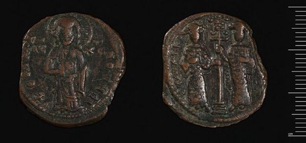 Curator: This piece before us, an Anonymous Follis from the Harvard Art Museums collection, presents a worn, almost ghostly presence. The details are faded, yet it feels heavy with stories, wouldn't you agree? Editor: Heavily patinated, certainly. This copper alloy disc speaks volumes about material degradation and its interaction with soil chemistry over time. Curator: It’s like holding time itself in your hand. The image of who I believe to be Christ stares back at you, the cross on the reverse a simple yet profound statement of faith. I feel a strange empathy for whoever clutched this coin, so long ago. Editor: And consider the labor involved. Extracting the ore, smelting, striking the die—each coin represents a physical investment in the Byzantine economy, a tiny monument to collective effort. Curator: It's a beautiful, tangible connection. One can't help but wonder about the journey this coin undertook, who it touched. Editor: Indeed. A humble object, yet dense with information. I see the potential for fascinating investigations into Byzantine trade routes and workshop practices.