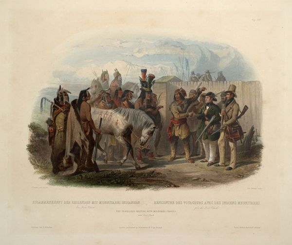 This print, made by Karl Bodmer, presents the Ischohä Kakoschochatä Dance of the Mandan Indians. Bodmer, trained in the tradition of European printmaking, skillfully used engraving and aquatint to capture this scene. Consider the process: each line etched into the metal plate, each tone carefully applied. This wasn't just documentation; it was a translation of lived experience into a format that could be reproduced and consumed in Europe. The very act of printing—a mechanised form of image-making—speaks to the colonial context in which Bodmer was working. And what of the materials depicted? Feathers, skins, and ceremonial objects, each carrying its own cultural significance for the Mandan people. Bodmer's print reduces these to mere images, devoid of their original power and purpose. The printmaking medium thus becomes a tool of appropriation. By attending to the materials and making of this print, we confront uncomfortable questions about representation, cultural exchange, and the power dynamics inherent in the artistic process.