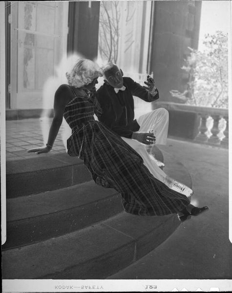 Curator: Cindy Sherman's "Untitled Film Still #22" from 1979, a gelatin-silver print, offers an enigmatic glimpse into imagined cinematic narratives. Editor: Immediately, the composition strikes me. The dramatic recession of the stairs, the strong diagonals—it creates this potent sense of movement and expectation. It is incredibly evocative using mostly grayscale values. Curator: And isn't that what Sherman achieves so brilliantly? By using these familiar visual tropes—the black and white, the setting on a grand staircase, the poised figure—she triggers our cultural memory, evoking a range of female archetypes we've internalized from film. The woman appears elegant yet subtly melancholic, burdened almost. What associations does the figure conjure for you? Editor: Well, structurally, I think the juxtaposition is fascinating. We have the almost monumental architecture, juxtaposed with this one solitary, descending figure. This contrast imbues the individual, in the role, with a fragility but, at the same time, importance. This woman takes center stage in this otherwise sterile and impersonal setting. The composition highlights tension between environment and persona. Curator: Precisely, and her studied ambivalence is crucial. This image operates less as a representation of a specific character than as an examination of representation itself. She seems a composite, an Everywoman fashioned from cinematic and societal expectations, reflecting constructed ideas of the female psyche and character in popular media. This resonates, for me, with Jung's Persona—the socially accepted mask we wear. Editor: Yes, the performance of identity becomes paramount, doesn't it? The gray monochrome creates an environment that almost acts as a vacuum—voided of most details to emphasize Sherman’s embodiment of her assumed character in a raw almost austere way. Curator: I agree. This image allows us to explore and reflect on the way our culture manufactures desire and fantasy around the feminine ideal. It continues to resonate. Editor: Absolutely. It remains a compelling analysis of cinematic codes, gender roles, and the power of visual language in shaping our perceptions. A wonderful study.