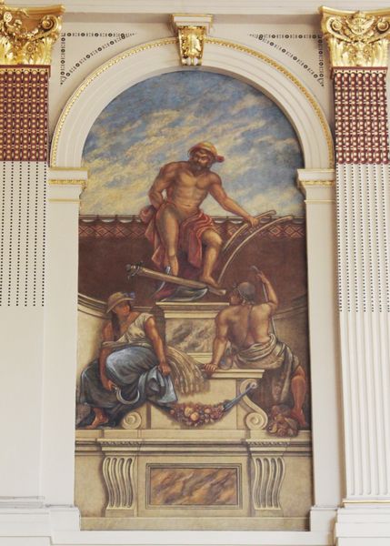 Károly Lotz created this painting, titled "Metallurgy," as an ode to industry. Painted during a time of great optimism about progress, it reflects a belief in the transformative power of labor and technology. The central female figure embodies strength, standing with a hand resting on a hammer, a symbol of human ingenuity and skill. Yet, her idealized, classical form contrasts sharply with the two men working at the forge. They are rendered in a way that emphasizes their physical exertion. The painting raises questions about the value of labor and the romanticization of industry. While appearing to celebrate human achievement, there is an emotional ambivalence. The heavy labor required is set against the glorified image of progress. Through its juxtaposition of idealized and realistic figures, "Metallurgy" reflects the complex relationship between progress, labor, and representation. The painting captures the spirit of an era while subtly revealing its tensions.