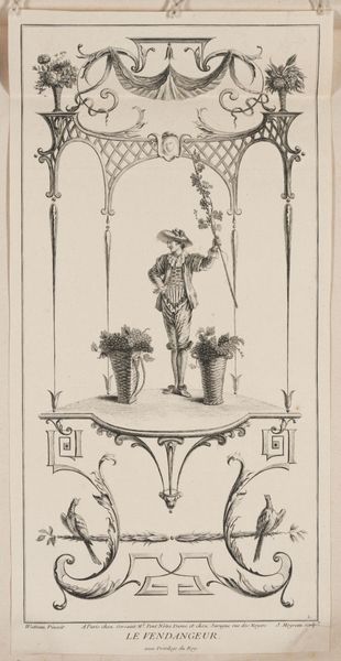 Editor: This is Pierre Alexandre Aveline's "Bacchus." It's a plate, so likely an engraving, and the composition feels so meticulously balanced, almost like a stage set. What historical contexts do you consider when viewing this piece? Curator: It's fascinating to consider how Aveline uses Bacchus, the god of wine and liberation, during a time of rigid social hierarchies. How might this image of revelry challenge or reinforce those structures? Editor: That's interesting. It feels contradictory, almost like controlled chaos within a very decorative frame. The title mentions "privilege du Roy" as well. Curator: Exactly. It connects to power. Is this Bacchus for everyone, or only for the King? And how does that impact our understanding of freedom and access within 18th-century France? Editor: I hadn't considered the implications for class and power. Thinking about it now, this is not just an image of celebration. Curator: Precisely. Now, what other contemporary discussions does this work trigger for you? Editor: I'm now thinking of the role of art under oppressive regimes, and this puts it in a new perspective. Thanks for this insight.
