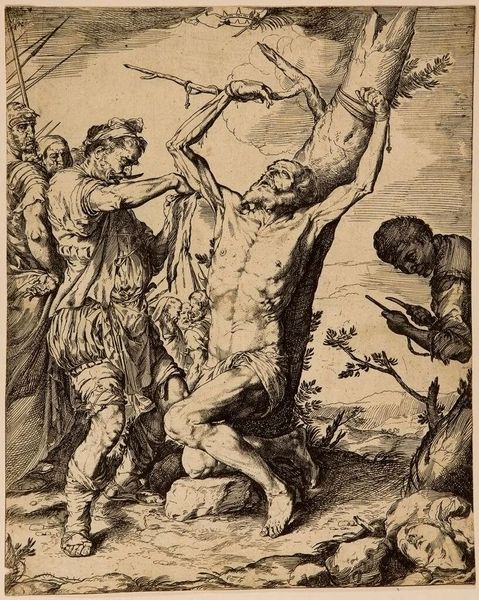 This is Jusepe de Ribera's "The Martyrdom of Saint Bartholomew," an etching now housed in the Metropolitan Museum of Art. The stark, almost brutal, composition immediately grabs your attention. Ribera uses line and shadow to sculpt the scene, creating deep contrasts that emphasize the raw physicality of Bartholomew's suffering. The composition is structured around the diagonal thrust of Bartholomew's body against the rough verticality of the tree trunk. This juxtaposition creates a tension that is both physical and emotional. The executioner and his cronies stand to the left, their faces obscured by shadow, embodying a dark, impersonal force. To the right a man prepares his blade, a tool of his trade. Ribera masterfully employs a semiotic system where light signifies grace and shadow embodies the moral darkness of the execution. This etching is more than a depiction of martyrdom, it's a study of the human form under extreme duress and a philosophical exploration of the boundaries between body and spirit. The formal rigor of Ribera's etching ensures its enduring power.