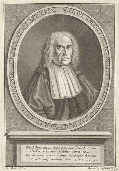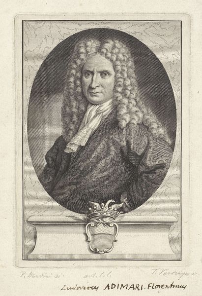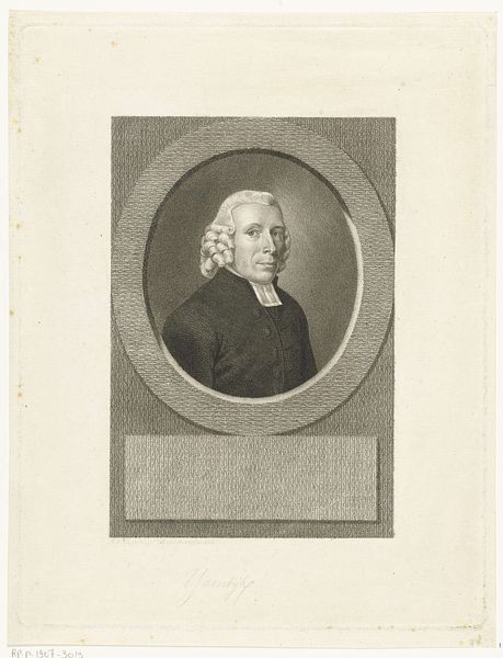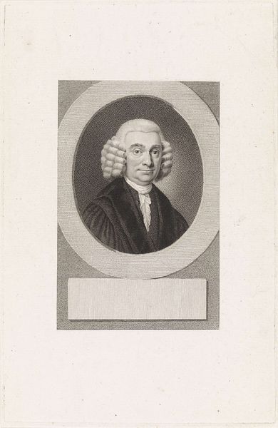 This portrait of Hermanus Johannes Krom was created by George Kockers, using etching and engraving. The oval composition, with its monochrome palette, immediately invokes a sense of classical formality. The subject’s profile, sharply defined, becomes a study in contrasts. Notice how the dense, almost sculptural curls of his wig are set against the smooth expanse of his forehead. This interplay of textures draws our attention, inviting a tactile as well as visual experience. The meticulous detailing achieved through etching and engraving emphasizes the sitter’s features, lending him an air of scholarly intensity. Framed within its oval border, the portrait operates as a sign, meticulously constructed to communicate status, intellect, and perhaps, the weight of tradition itself. Consider how each formal element — the line, the shading, the carefully chosen font — works to reinforce this image. The portrait, in its formal construction, participates in and perpetuates a particular understanding of power and representation.