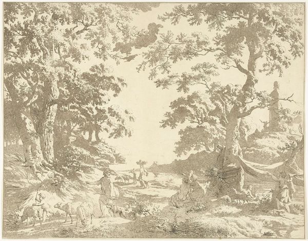 Editor: This is Jacob Cats’s "A Wooded, Hilly Landscape with Herders." It's a delicate drawing, I think, with so much detail. What strikes you most about its historical context? Curator: It's interesting to consider how this idealized pastoral scene reflects broader societal views. Images like these served to legitimize certain power structures. Does the inclusion of herders evoke a sense of timelessness? Editor: It does, but also maybe a sense of... ownership? The land is being "used." Curator: Precisely. Consider how landscapes often functioned as symbols of national identity and territorial claims. What do you make of the absence of more overt markers of ownership, like fences? Editor: Perhaps it's downplaying the reality of land enclosure, creating a more palatable vision. I never considered that angle before! Curator: Thinking about the public function of art always opens new avenues for interpretation.