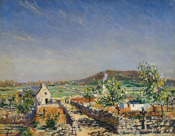 Curator: William York Macgregor painted this landscape, *The Carse of Stirling*, sometime during his career, a view held in the Tate collection. Editor: There's a stillness to this. The brushstrokes are loose, but there's such a strong sense of place, a sort of quiet melancholy. Curator: Indeed, the Carse of Stirling is a flat, fertile plain, historically significant in Scottish agriculture and power struggles; that castle looms on the horizon. Editor: It’s like a memory, the landscape fading just a bit, but the feeling – that endures. The symbolic resonance of the castle overseeing the plain below has strong emotional meaning. Curator: The bare trees, the muted colors—they speak to the cyclical nature of life, and the enduring connection between the land and those who inhabit it. Editor: Makes you wonder what stories that earth holds, doesn't it? Beautifully understated.
