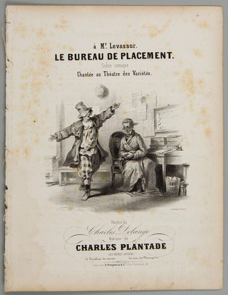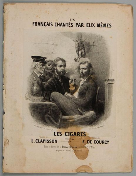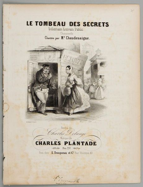 Editor: This is "The Stage Coach Stop" or "Departure and Arrival," the cover of sheet music by Victor Coindre. It feels like a snapshot of a bustling moment. What symbols do you see at play here? Curator: The stagecoach, of course, is a powerful symbol of transition. People entering and exiting represent life's journeys, the choices we make, and the constant state of flux. The individuals themselves, how are they dressed, and their expressions? What do they tell us about that period and the collective memory? Editor: I hadn't considered the clothing as symbolic, but it definitely signifies social class and even aspirations. Thank you! Curator: Indeed, visual culture embeds meaning. Reflect on how seemingly simple images can speak volumes across time.