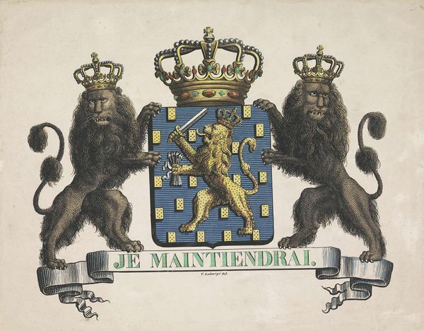 Editor: This is Henricus Wilhelmus Couwenberg's "Wapen van Nederland met motto: Je Maintiendrai", an engraving from around 1830 to 1845. It’s quite striking! What do you make of its... symbolism, I suppose? Curator: I see a powerful articulation of nationhood through the lens of Neoclassicism, a style that frequently draws on historical and mythological themes to reinforce contemporary power structures. How does the motto "Je Maintiendrai" – "I will maintain" – resonate with you in today's political climate, given the resurgence of nationalism? Editor: It feels… loaded, doesn’t it? All that classical imagery feels like a bold claim of historical legitimacy. Do you think it’s trying to evoke a certain kind of authority? Curator: Absolutely. Think about how this imagery connects to colonial legacies and the construction of national identity. Whose narrative is being amplified here? Whose is being silenced? Look closely at those lions, at the crown. What do they *really* represent when considering issues of class and colonialism? Editor: Hmm, it definitely makes me reconsider what "maintenance" really means in this context. It's not just about preserving a nation, but preserving power. Curator: Exactly. Art is never neutral. It's always operating within, and often reinforcing, specific power dynamics. The piece invites us to question who benefits from this particular representation of the Dutch nation. Editor: This makes me think about how national symbols can be so easily co-opted and re-interpreted through various cultural and political agendas. Curator: And how critical engagement can challenge those narratives and expose the underlying power structures that shape them. Thank you, I will consider this in my upcoming analysis. Editor: Thanks to you, too. Now I’ll think twice about the role of seemingly neutral symbols in solidifying particular identities and viewpoints.