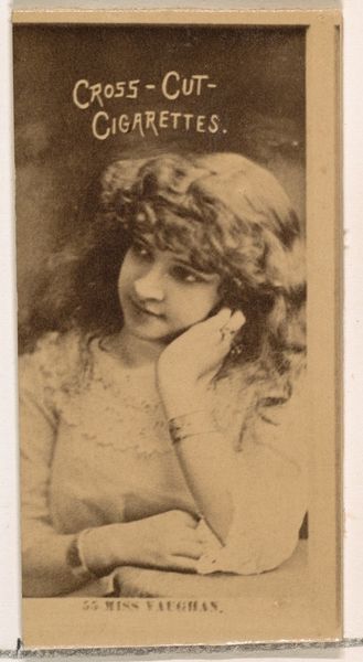 Curator: Isn’t this charming? This is "Card Number 165, Miss Millivard," from the Actors and Actresses series. W. Duke, Sons & Co. created it in the 1880s as a promotional item for their Duke Cigarettes. It combines photography with, presumably, printmaking. Editor: She looks wistful, almost dreamy. The soft sepia tones enhance the sense of nostalgia, a delicate sadness, wouldn't you say? Curator: Absolutely. But thinking about W. Duke, Sons & Co., these cards weren't made to inspire wistful longing. These were churned out, part of the industrial machine meant to addict more people to nicotine. Miss Millivard’s image, produced en masse, cheap materials, wide distribution, aimed at capturing as much market share as possible... the commodification of beauty and talent, literally stuck inside a cigarette pack. Editor: Well, isn't that the duality of beauty? She's transformed into something…marketable. Imagine, though, her fleeting fame immortalized on something so fragile, so ephemeral, even if attached to the grubby business of tobacco! What was her life like, did she ever see this little card? Curator: Precisely! The backs of these cards, I believe, sometimes even included details about cigarette manufacturing. Talk about a collision of worlds. It makes you question the whole concept of "art" itself, doesn’t it? Who decides what deserves reverence? Is it the hand of the artist, or is it context? Or is it about the conditions that let the work breathe? Editor: Both, maybe? There is something strangely intimate about seeing Miss Millivard looking back at us from across so many years, however she got there, or why. That combination of photographic likeness reproduced through commercial means - a pre-digital snapshot that has survived time's little erosions. Curator: In a way, Miss Millivard lives on in these small images and even if she might not get any royalties, the layers behind them tell of their moment and she, almost ghostly, gets to join our very present. Editor: And from a mass-produced cigarette card, that is almost something, isn't it?