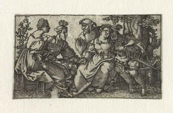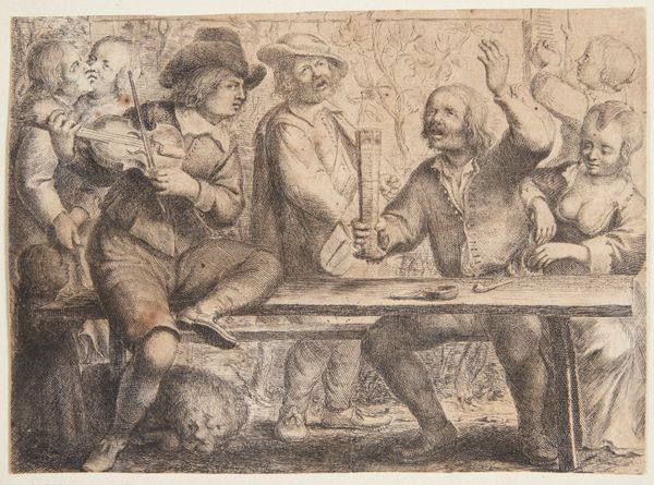 Curator: Look at this intricate engraving titled "Muzikanten en drinker in een herberg," or "Musicians and Drinker in a Tavern," made in 1828 by William Young Ottley. What’s your first impression? Editor: Pure, unadulterated revelry! It’s like a frozen moment from a rowdy pub, teeming with life – maybe a bit too much life for some, ha! Curator: Indeed. What I find striking is how Ottley uses seemingly simple lines to create such a sense of depth and chaotic energy. You can almost hear the music and smell the stale beer. Editor: You nailed it. I'm drawn to the central figure hoisting that monumental glass. It feels symbolic, almost a defiant gesture against...well, against everything! Notice the small dog: a detail or a symbol? Curator: It definitely reads to me as a wink to Baroque genre paintings that idealized the lower classes, elevating their ordinary, sensory experiences to grand symbolic themes. Think of Bacchus. Editor: So the drinker could be seen as a Bacchus figure then, a personification of merriment. The musical instrument player sits beside him as well: they become players on the stage of desire. Yet that dark foreground...does this imply darker meanings too? Curator: Possibly! A commentary on excess perhaps? On one hand, the dog, for example, traditionally symbolized loyalty, but here it looks like it wants to leave that room now, but that detail is offset by its awkward positioning beneath the central figures. Editor: I can't help but wonder, though, what were Ottley's intentions. Was he simply documenting a scene, or was he critiquing it? The composition leaves me feeling delightfully uncertain. I see my former student parties, their unadulterated energy of life! Curator: Right? Art, in its best moments, mirrors our experiences back to us. Thanks, this engraving provides us an excuse to linger in that blurred state a little longer!