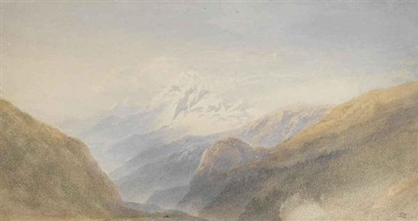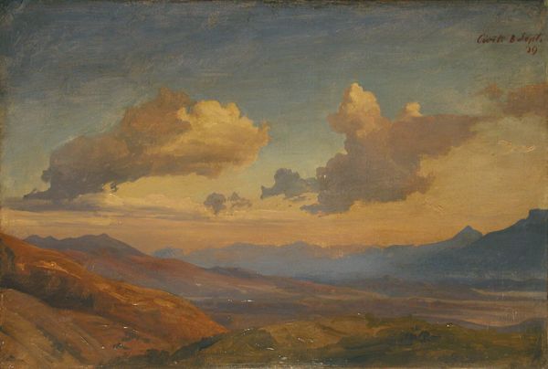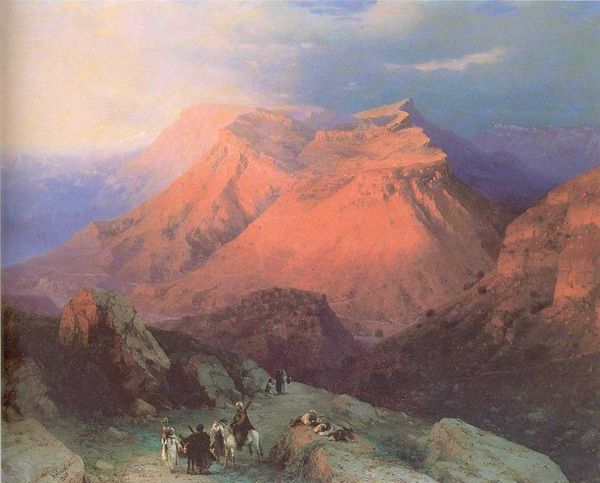 Editor: So here we have Aivazovsky's "View of Gunib," painted in 1868 using oil paints. It's such a majestic, almost imposing landscape. What strikes you most when you look at this painting? Curator: I'm immediately drawn to the materiality of it. The thick application of oil paint, the way he builds up the surface to create those mountainous forms, it speaks to a specific mode of production tied to that period. Consider the socio-economic conditions – where did Aivazovsky source his pigments? Were they locally produced or imported? Editor: That's interesting! I was just thinking about the Romantic feel of the landscape. Curator: Absolutely, the Romanticism is evident, but I wonder, can we see that as a commodity as well? It's not just about aesthetics, it’s about the commodification of that idealized view. These sublime landscapes were often created for a consuming audience, for patrons who might never experience these locations firsthand. Editor: So, it's less about the artist's emotions and more about… the market? Curator: Not entirely. The artist’s labor, the sheer physical effort of creating this large canvas, needs to be acknowledged. Think about the tools he used, the studio space, even the apprenticeship he underwent. The final painting is a culmination of these very tangible, material processes. What do you make of the figures at the lower left, almost hidden in shadow? Editor: They seem dwarfed by the landscape. Is that another comment on humanity’s place within a grand, exploitable system? Curator: Perhaps. Or is it a way of subtly commenting on social classes and hierarchy? The consumption and even conquest of the landscape are implicitly present through their tiny presence, inviting us to consider the labour involved. Editor: This has given me a whole new perspective on landscape painting! Curator: Exactly! It's about pushing beyond just the aesthetic appreciation and understanding art as part of a much broader network of materials, production, and consumption.