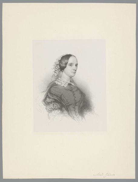 Editor: Here we have Joseph Schubert’s graphite drawing, “Portret van een onbekende vrouw,” made in 1859. The delicate rendering creates an intimate and gentle atmosphere, even though it is a portrait of someone unknown. What do you see in this work? Curator: This portrait, while seemingly straightforward, opens up a complex conversation about representation, power, and anonymity in 19th-century portraiture. Consider the subject: an "unknown woman." Whose stories are valued enough to be recorded and remembered? Who has access to the resources to commission or create a portrait? The elaborate lace bonnet and jewelry indicate a certain level of economic privilege, yet her name is lost to us. Editor: So, you are suggesting that even the fact that we don't know her name speaks to a larger cultural issue? Curator: Precisely. Whose narratives get suppressed or erased? How do traditional art historical practices contribute to or challenge these imbalances? The detail given to her attire, in contrast to the anonymity surrounding her identity, suggests a societal focus on appearance and status over individual agency. How does the artist, Joseph Schubert, participate in these social dynamics? Editor: It is a bit troubling, isn't it? This tension between her presence in the portrait and her missing identity. Curator: Absolutely. It’s a tension we must acknowledge. This is more than just a drawing; it’s a reflection of a specific historical moment, and it pushes us to consider the unseen forces that shape identity and representation even today. Editor: I see it differently now. It really prompts us to question the power structures embedded in art. Thanks! Curator: And to remember that engaging with art is about actively questioning and critically analyzing the narratives being presented – and those that are being omitted.