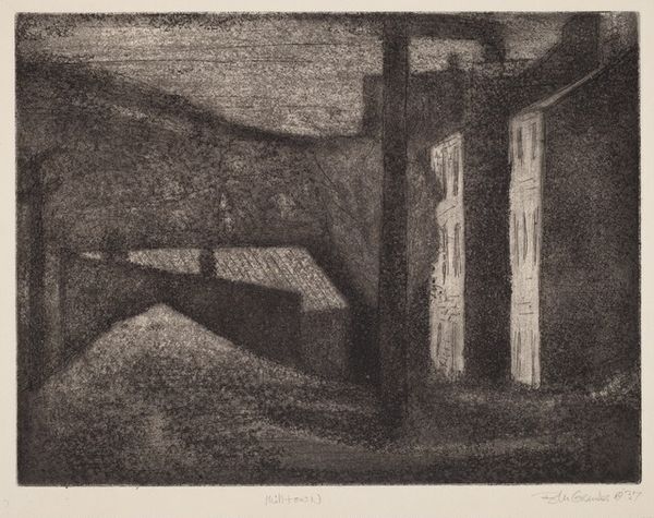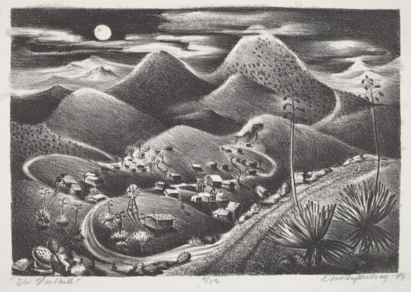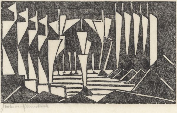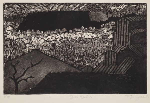 Editor: So, this is "Duck Lake, Ward, Colorado" by Harold Emerson Keeler, made in 1945. It’s a woodblock print, and it strikes me as quite graphic, almost stark in its contrast. What do you see in this piece? Curator: Well, immediately, the labour involved in the woodcut process comes to mind. Imagine the artist meticulously carving away at the block to create those sharp lines and textured surfaces. Each mark represents a physical act of labour, a direct engagement with the material. Editor: Absolutely! It's very tactile in a way that a painting wouldn't be. But how does the medium itself contribute to our understanding of the landscape depicted? Curator: It directs our attention to the artist’s craft, and challenges this assumption that "high" art is separate from modes of "craft." Consider the social context too – woodcuts were often used for mass reproduction, making art accessible to a wider audience, which is different than say, an oil painting. Does the artist challenge any perception of how we understand nature in the context of 1945? Editor: I hadn’t thought about its accessibility. I suppose it does make me reconsider who would have consumed this art, and how different classes of people could connect over landscape. The labor is now much clearer to me. Curator: Exactly! By focusing on the materiality and production, we gain insights into the social and economic factors that shaped the artwork, making art more egalitarian for consumption and engagement. We appreciate its artistry alongside its function and socioeconomic relevance. Editor: I see what you mean, looking closely at the materials really opens up a different way of considering art beyond just aesthetics. Thank you!