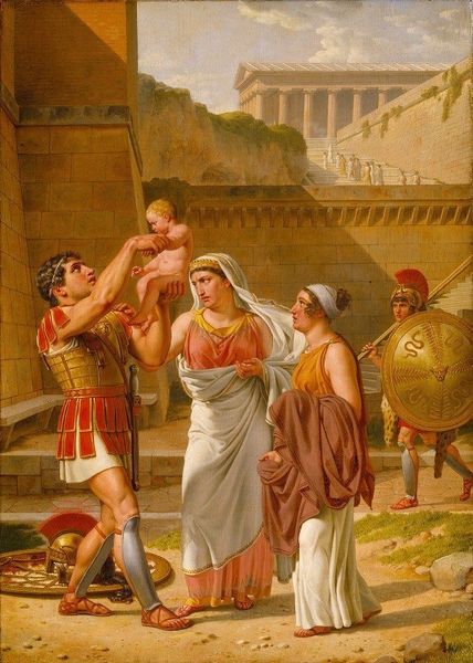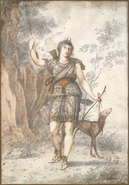 Editor: Here we have James Tissot's "Jephthah's Daughter" from 1902, created with gouache. There's something really striking about the figure, especially the drum she's holding; it almost feels protective, yet there’s also a strange sense of foreboding hanging in the air. What do you see in this piece? Curator: I see echoes of ancient sacrifice and societal expectations rendered in a strikingly modern style for its time. Notice how Tissot frames her – she's partially obscured by the drum, and the architectural setting feels almost claustrophobic, heightening the emotional tension. The drum itself – a joyous instrument – here becomes a symbol of her impending fate. Think about the historical and cultural memory associated with musical instruments like this; drums signal celebration, yes, but in religious contexts they mark ritual, sometimes solemn ones. Editor: That's fascinating. The drum as a marker of ritual, I hadn't thought of that. Is the ornamentation significant too, do you think? Curator: Absolutely. Look at the intricate detail of her headdress and belt, each a deliberate marker of her status. Tissot’s attention to these details situates her within a specific cultural narrative while universalizing her plight. Can you imagine the weight of cultural expectation bearing down on her, symbolized by the very objects intended to adorn and elevate her? Editor: I do now. The painting definitely tells a much deeper story than I initially realized, and those cultural layers really amplify the emotional impact. Curator: Precisely. Art offers us these silent dialogues across time, and by recognizing those symbols, we engage with not just the artwork but with a profound contemplation of human experience. Editor: I’ll definitely look at paintings differently now, considering those layers of meaning hidden within. Thanks for pointing them out!