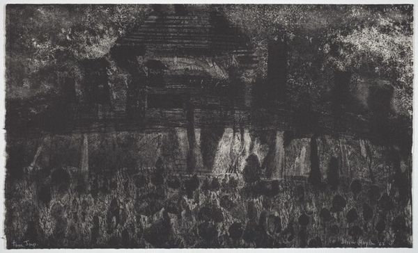 Curator: This is "Trumpets", a 1961 etching by Sid Hammer. The printmaking process renders an interesting composition, wouldn’t you agree? Editor: Yes, immediately, the somber and anxious mood jumps out at me. The rough, scratchy lines create a stark, almost apocalyptic atmosphere. What’s the story here? Curator: The means of production were undoubtedly laborious. The artist scratched lines into a metal plate, painstakingly layering to create these contrasting values of light and dark. It seems to highlight a real contrast. Look at the flat plain in contrast to the crowded lower portion. Editor: I see that contrast. And for me it’s as if two distinct social realities are presented. There's a mass of people, maybe refugees, clustered together under what appear to be ominous shapes looming above, maybe housing or just an oppressive sky. Curator: You're right, it’s quite heavy in the application of ink, isn’t it? Notice how the forms of the people are rendered. They seem pressed together, their individual identities somewhat blurred, almost consumed. A direct comment perhaps on their socio-economic situation. Editor: Exactly! Their collective vulnerability becomes a central theme. Are they seeking shelter? Or perhaps expressing some collective grief or anger? I am also thinking about how, post-World War Two, there was great displacement in many regions and also the rise of the fear of nuclear warfare, both being heavy socio-political anxieties. Curator: It’s interesting to see the abstraction, alongside figuration too. Hammer employed printmaking in the middle of the 20th century; his use of technique surely meant he was considering mass production. Print lends itself to the dispersal of ideas, just as much as images. Editor: That's a strong point. And it makes me consider the power dynamics inherent in image distribution during this era. Whose voices were amplified, and whose were marginalized? And this print could be a subtle commentary on those structures. Curator: This has made me consider the labour of producing art, against the possible socio-political contexts informing such an atmosphere, captured so effectively in lines of dark ink. Editor: I'll leave feeling concerned for humanity in times of displacement, and considering those artists reflecting society at various points in history, like this.