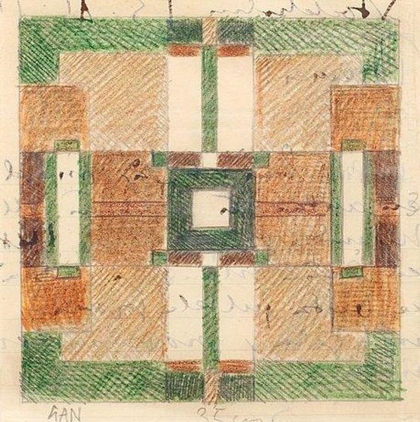 Editor: Okay, so here we have Theo van Doesburg’s “Sketch for the ceiling” from 1923. It looks like mixed media on paper. I find it mesmerizing in a strangely calming way. All those geometric shapes. What catches your eye in this work? Curator: Mesmerizing is a good word. It has a vibrational quality doesn't it? I see a kind of contained energy, almost architectural, like a blueprint of a feeling. For me, it's less about the static forms and more about the dynamic relationships *between* those forms. Think of it as a dance— a carefully choreographed ballet of shapes, colors, and lines frozen in a moment of perfect tension. Do you see the intentional disharmony between these blocks? How would you imagine it translated onto an actual ceiling? Editor: Right, there’s tension, I agree. It’s not perfectly symmetrical, is it? Maybe that's what keeps it interesting. If it were on a ceiling… would it feel unbalanced? Curator: Potentially. Perhaps unbalanced enough to disrupt the harmony of a room, or perhaps to create a *new* kind of harmony? Think of it as challenging the very idea of "ceiling," of "home," of comfort. I wonder what kind of space van Doesburg envisioned this for... Editor: That's such a cool idea – a ceiling that questions the room. I hadn’t considered it that way. Curator: Art often asks us to look beyond the obvious, doesn’t it? To feel a question rather than receive an answer. Editor: Definitely. I came in seeing just a geometric design, now I’m picturing entire rooms turned upside down. Curator: Wonderful! So the ceiling…becomes the floor? Our perspective shifts…And we, dear listener, are perhaps a little bit closer to understanding what Van Doesburg intended.